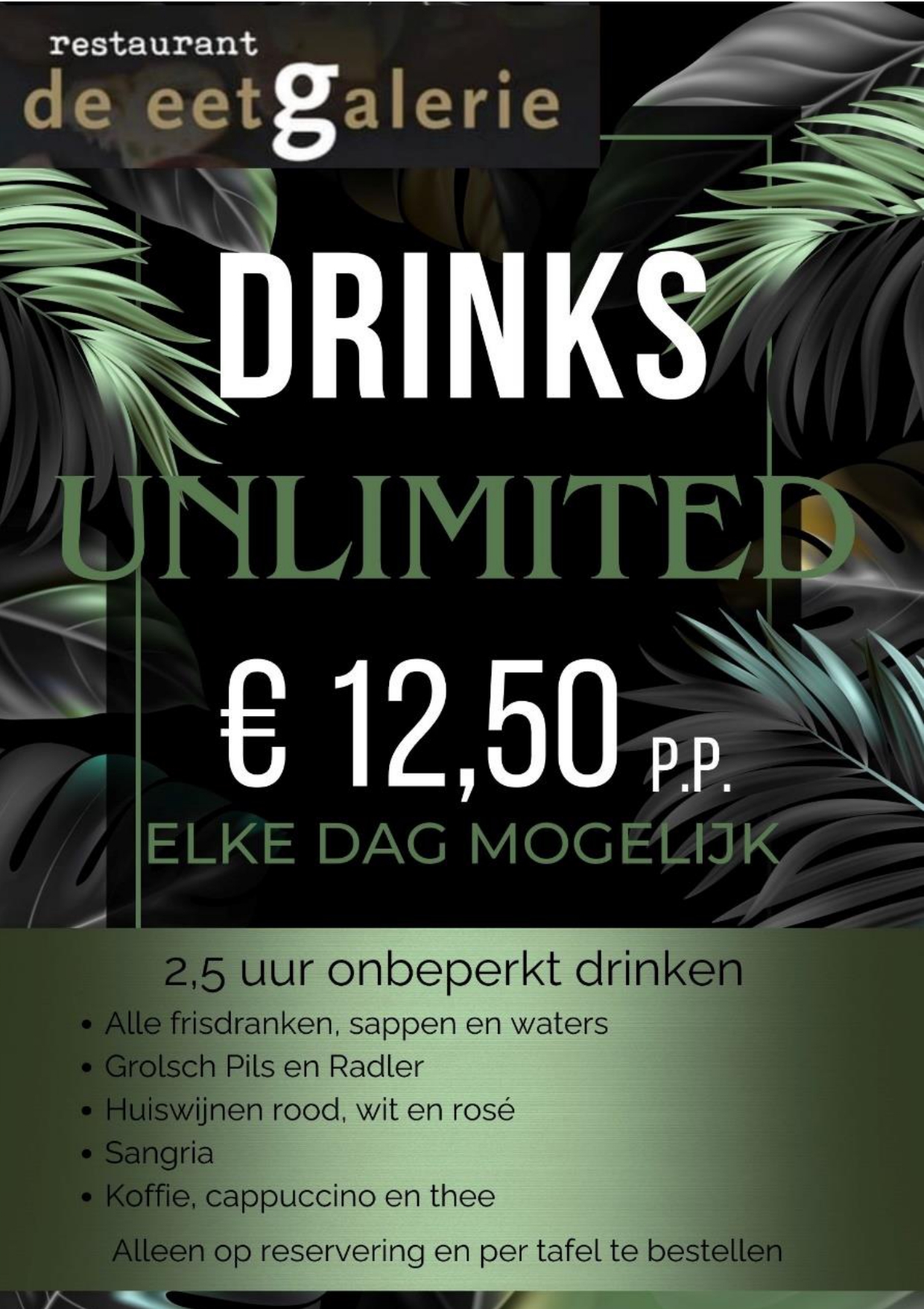 Proost! Tijd voor een heerlijke avond zonder zorgen. Met Drinks Unlimited geniet je 2,5 uur lang onbeperkt drinken (Pils, Huiswijn, Frisdranken, Sangria, Koffie, Thee, Cappuccino) voor € 12,50 per persoon.